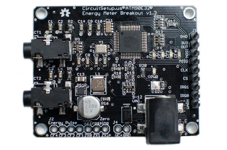 The ATM90E32 IC can measure up to three AC voltages although typically only one voltage measurement would be used for the mains electricity phase of a household. Three current measurements are read via CT clamps.
